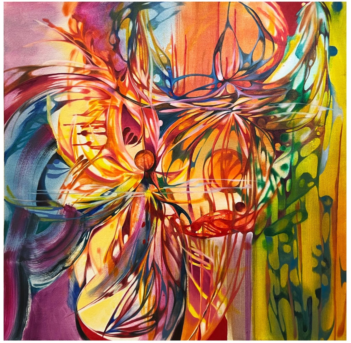 Yes, in a way. Because contradiction is also a big topic for me, I like to portray it in the paintings as well. Fluid marks co-exist with more defined, strictly planned marks. It’s like opposite feelings co-existing within oneself. Combining a more expressive and uncontrolled gesture like throwing fluid paint on the canvas, with more controlled and intentional brushstrokes is a way to portray contradiction and balance.